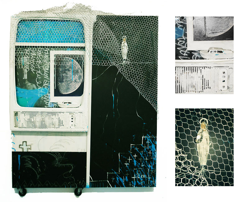 Mixed Media - Wire Mesh, Front of Old Television Set, Feathers, Perspex and Acrylic Paint on Board